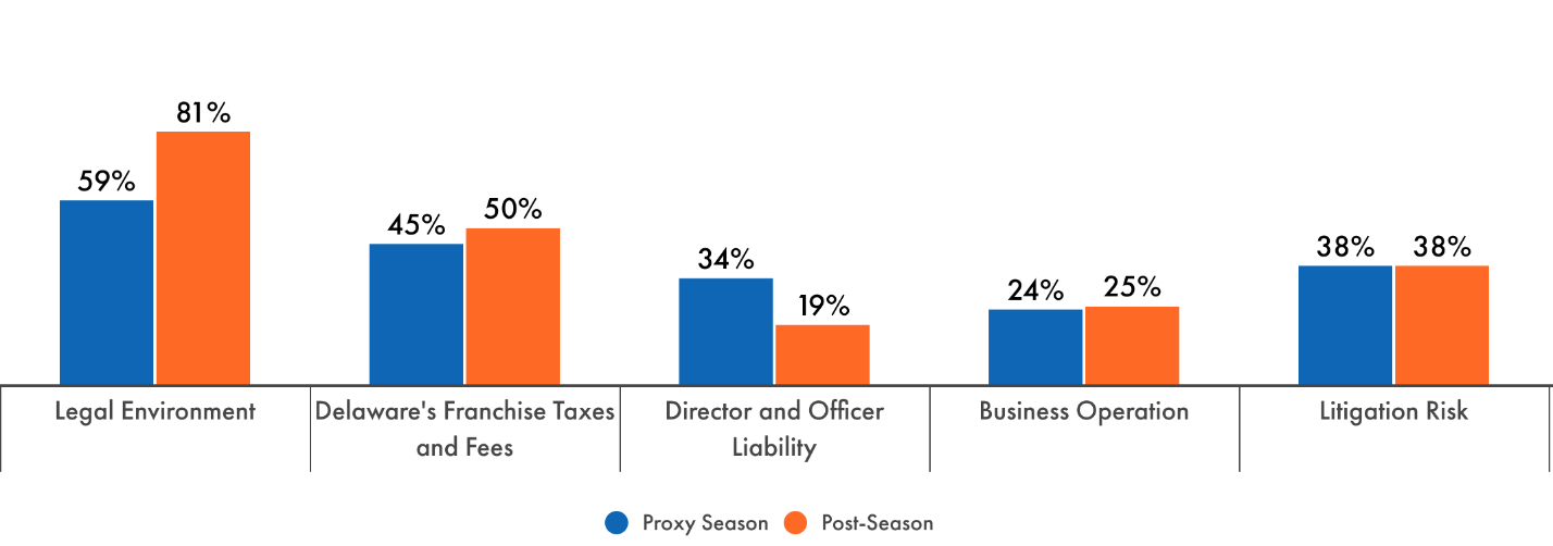 Risk posed by the general legal environment in states continued as the most cited rationale and increased in frequency by a significant margin (22% increase vs. proxy season), while concerns with D&O liability dropped in frequency (15% decrease vs. proxy season). This may indicate that states’ corporate laws and the shareholder rights provided by these laws were a more significant factor than risk from specific litigation targeting directors and officers, particularly following the amendments made by Delaware, Nevada, and Texas.